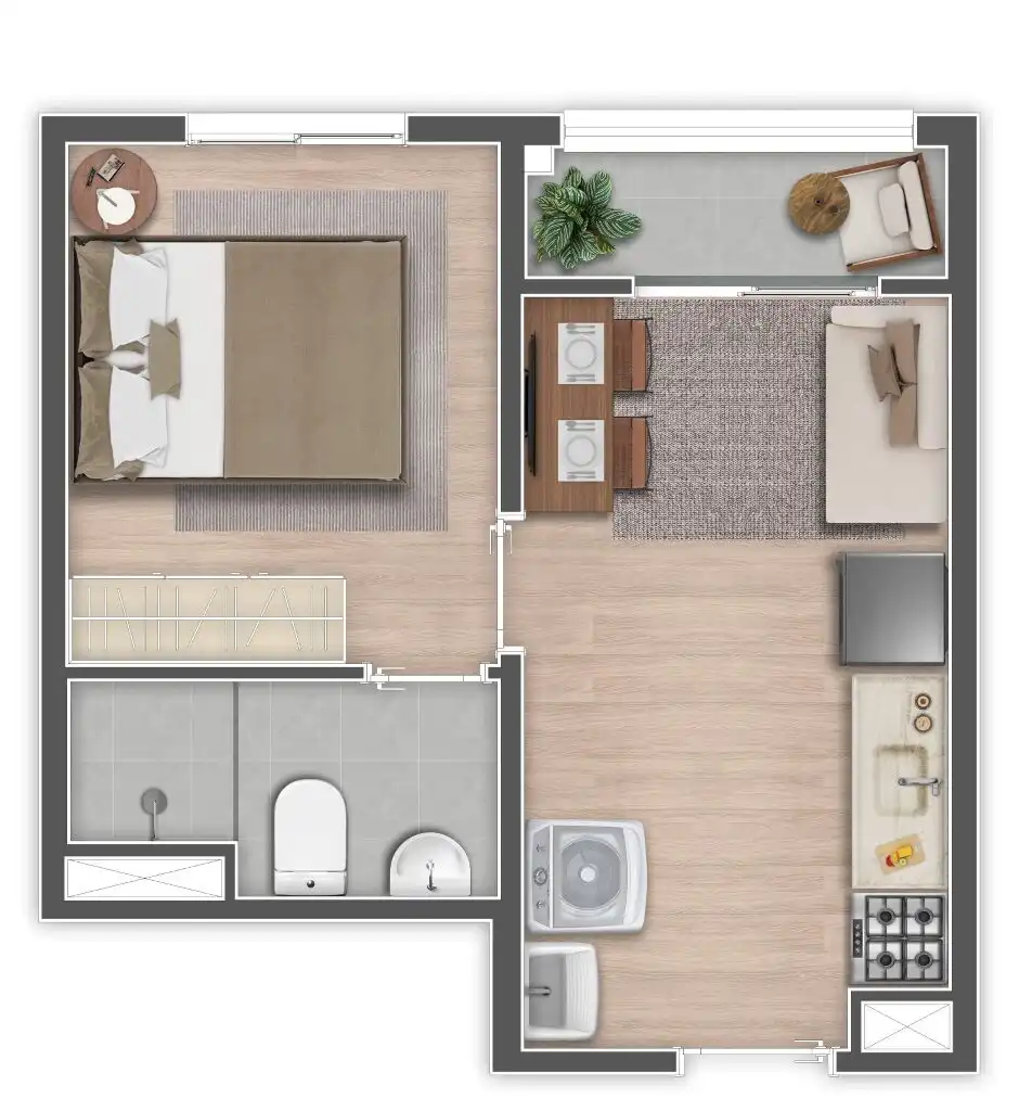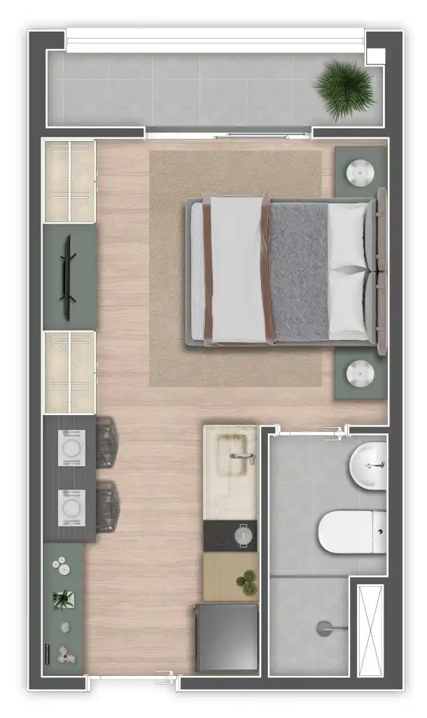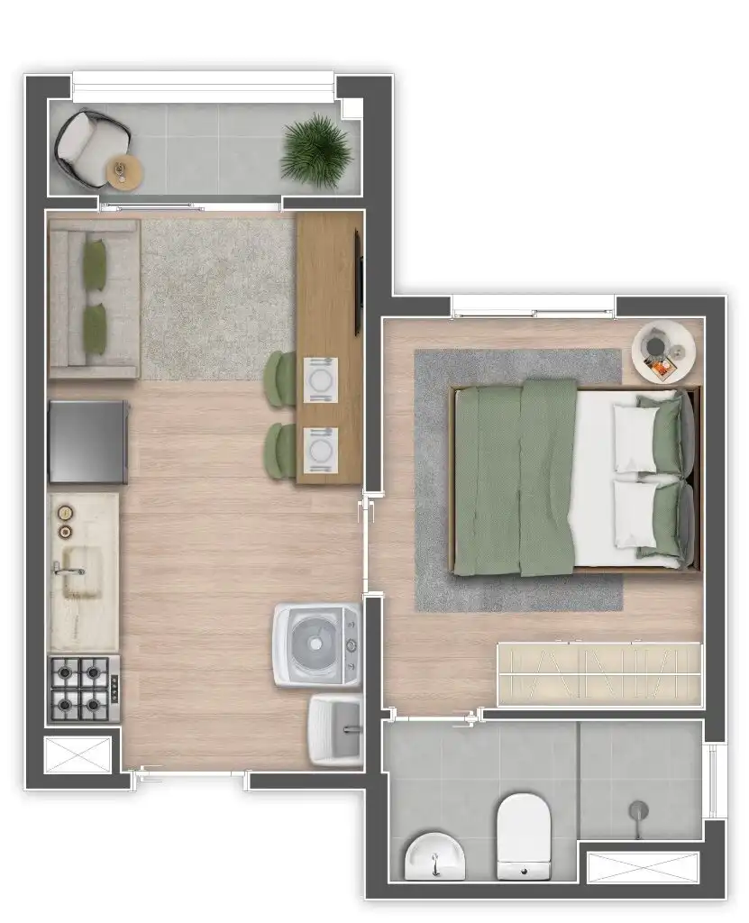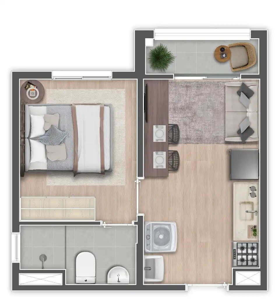 Os apartamentos — Studios e 1 dormitório com varanda — têm plantas inteligentes, acabamento moderno e tudo o que o público urbano procura.
